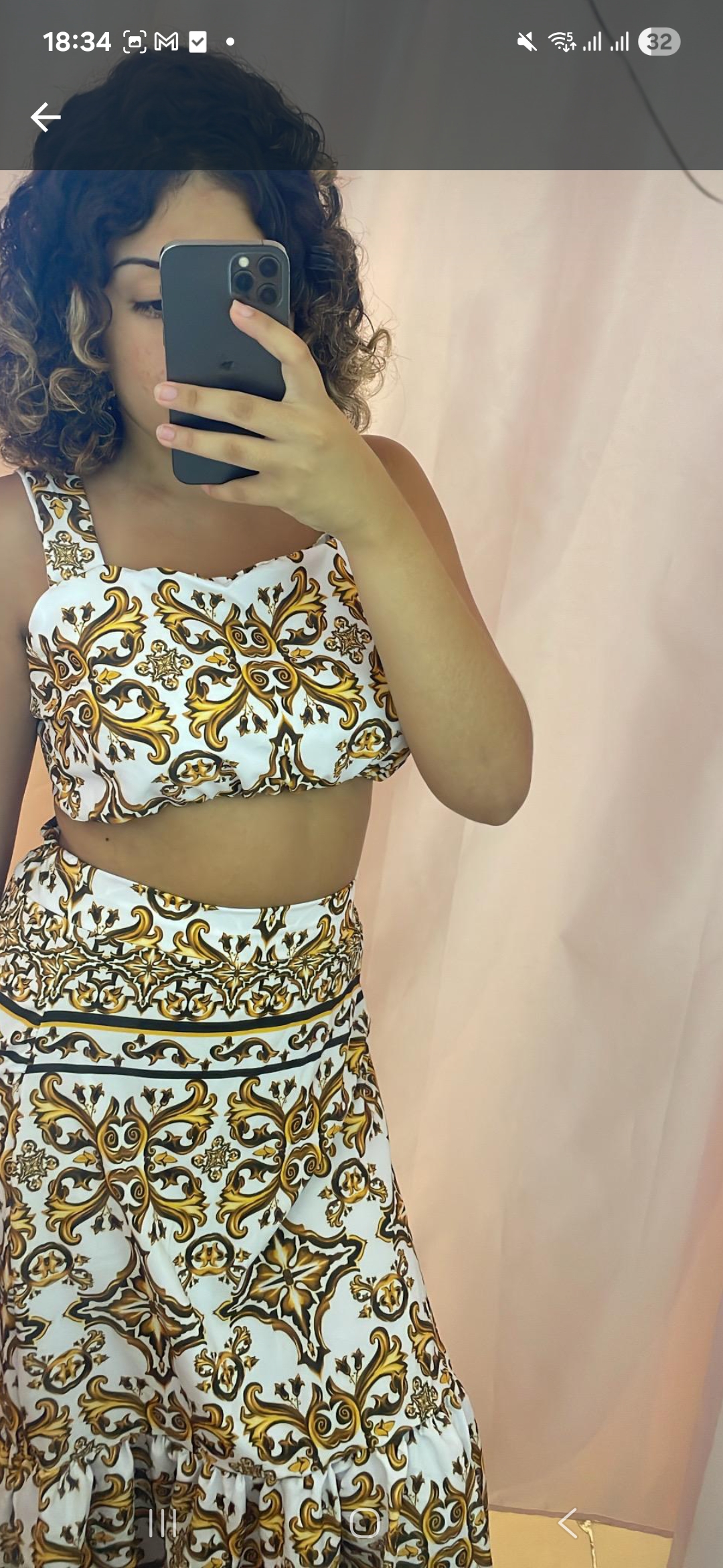 Conjunto feminino elegante composto por cropped e saia midi,com estampa sofisticado